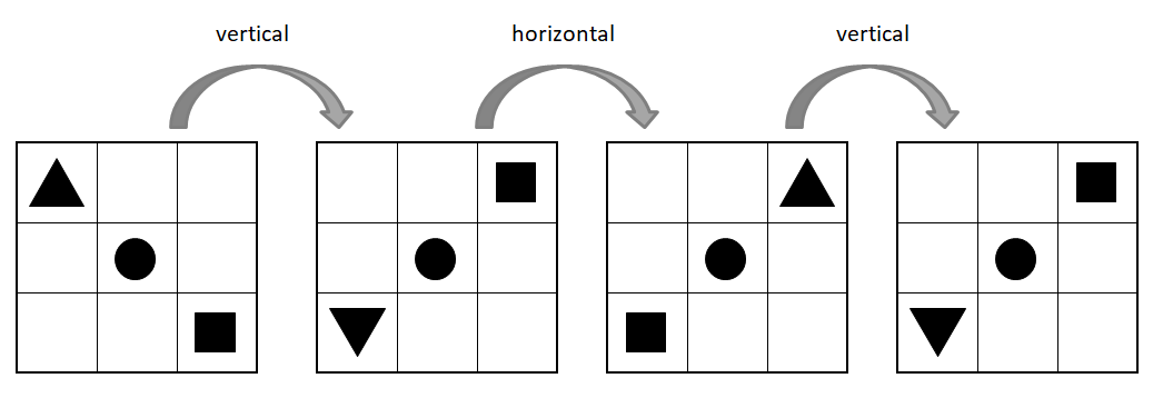 Reflections can be very difficult to spot as users often can mistake the reflections for rotations or some other type of movement change. Reflections basically mean that objects move by flipping the in this case the “frame” horizontally or vertically. Remember, if you can’t really spot the movement pattern of the objects, immediately try to identify if you are looking on an example of reflection movement.