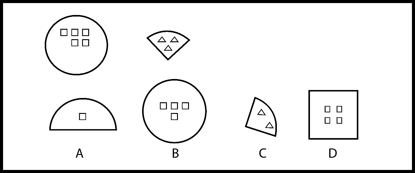 So, if you look at the two shapes and the only clue that stands out here is the NUMBER of the shapes contained within. 5 and 3, ODD numbers, looking at the answers only A has an odd number 1, so that is the quality you are seeking. There are no other shared qualities. Tip: Seeing one shape is a clue for odd versus even!