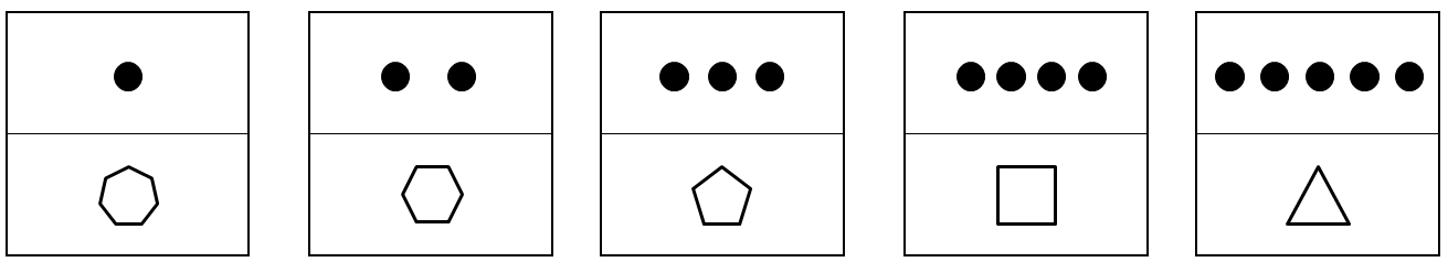In this particular example a shape is followed by a forward arrow, and a number ‘n’ then the same shape will reappear ‘n’ places down in the sequence, in the same position. If a shape is followed by a backwards arrow and a number ‘n’ it will have appeared ‘n’ places earlier in the sequence. Here we see the numbers act as indicators but it is common to see other objects such as arrows or the position of the object to act as indicators as well.