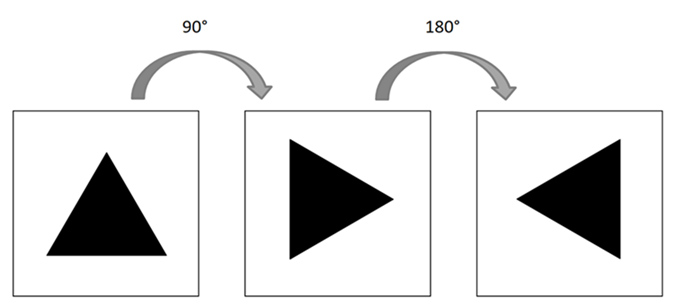 Firstly, you’ll notice the marker (the blob) on the apex of the first, showing you the top of the shape. This shape changes POSITION, it has rotated in different ways, it hasn’t changed size, and for each option, there are two small circles, both are consistently black and white. The black is POSITIONED at the bottom of the shape. The white at the apex.