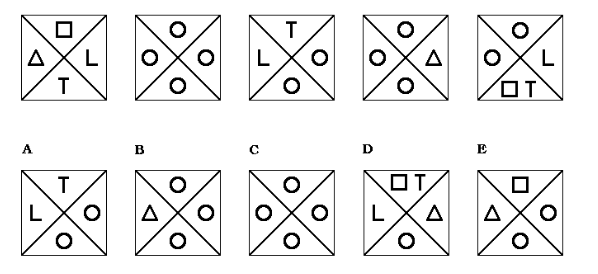 Pertanto il quadrato appare ogni quattro diagrammi dopo la sua prima apparizione, il triangolo ogni tre e le forme L e T ogni due. Nella risposta che contiene quindi quattro cerchi non è prevista alcuna forma.