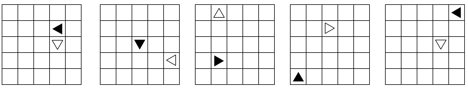 Nell'esempio seguente il triangolo nero si sposta di un quadrato verso il basso e di uno a sinistra e gira in senso antiorario di ¼ di cerchio in ciascun fotogramma. Il triangolo bianco si sposta di un quadrato verso il basso e di uno a destra e gira in senso orario di ¼ di cerchio in ciascun fotogramma. Tutti i triangoli si muovono lungo un percorso diagonale: quando un triangolo raggiunge il bordo della griglia continua all'inizio del suo percorso diagonale.