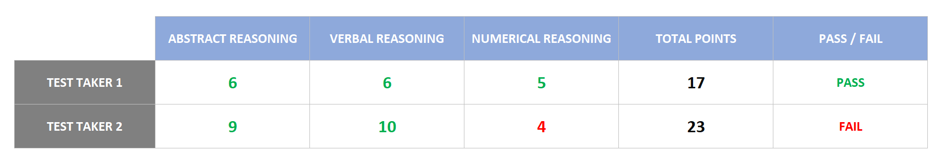 In below example each category requires a minimum score of 5 points. You can see that the test taker 1 would not be directly disqualified as a pass mark is achieved in each category. Test taker 2 on the other hand performed much better at the test but failed to achieve a pass mark on numerical reasoning.